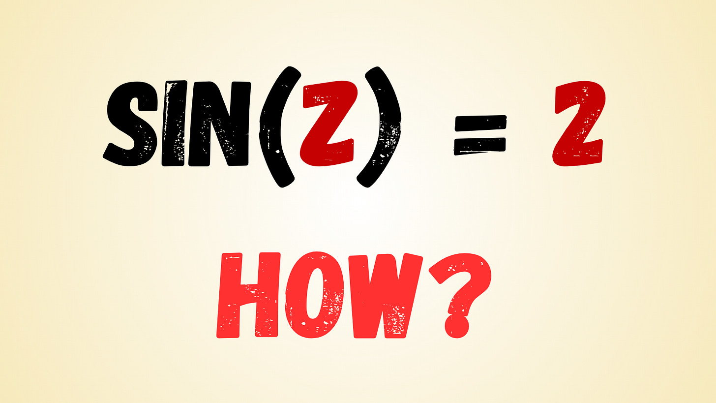 In this post, we’ll explore what it actually means to solve this “impossible” equation. We’ll dust off the definition of sine for complex inputs, break out a few exponential identities, and even peek at a contour plot of sin(z)just to see how far the rabbit hole goes.