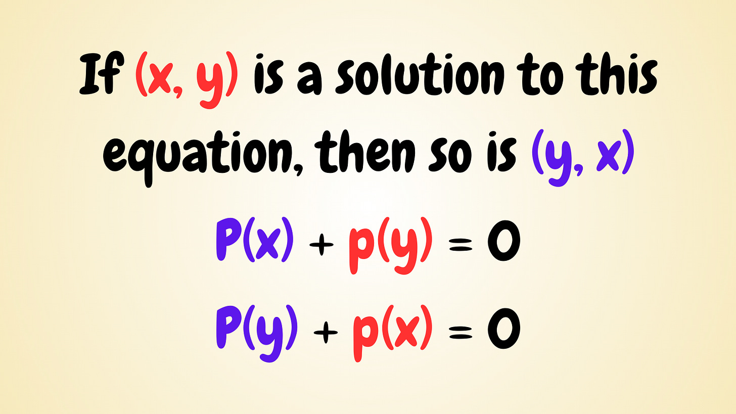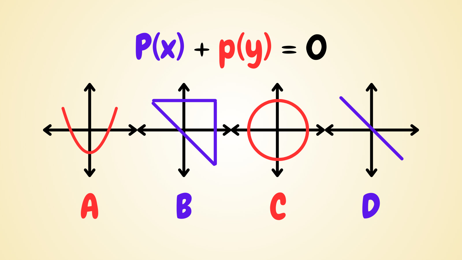 Here p is some arbitrary polynomial. Now let’s say we have p(x) + p(y) = 0. Which two of the 4 graphs above could be the sketch of the equation p(x) + p(y) = 0 the polynomial p?
