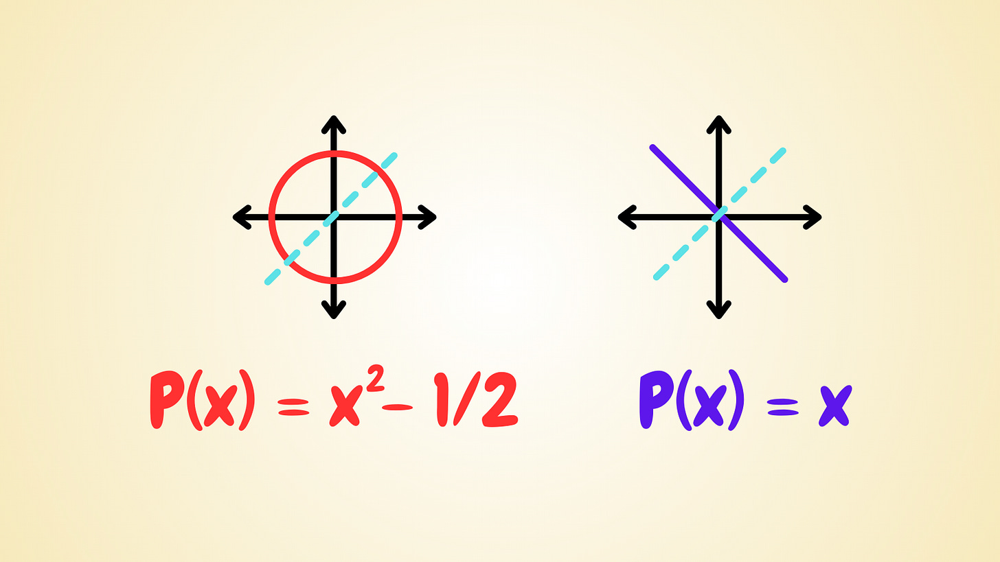 Equally for the straight line, if p(x) = x, then p(x) + p(y) = x + y = 0. So x = -y, which is exactly what the straight line is.